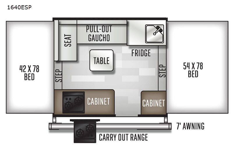 If you have been looking for sleeping space for 4 inside a folding pop-up camper then take a look at this Rockwood Extreme Sports 1640ESP by Forest River. You can choose to prepare your meals at either the indoor kitchen or head outdoors and cook them at the carry out range! After you have prepared your meals, you can comfortably enjoy them at the pull-out gaucho with a table or if you brought a folding table and chairs then you can enjoy it outdoors underneath the 7' awning. The spray away utility hose will be nice and convenient after those muddy excursions, and when you're ready to hit the sack you can choose to sleep on either one of the tent end beds, one in the front and one in the rear.